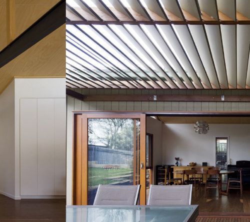 The best way forward was to re-build the rear section of the house to accommodate our new design. The rear of the house faces due north, which is excellent for passive design, however the fall of the land meant the house kind of squatted into the site. To overcome this challenge, we designed cathedral ceilings with gable windows for the new rooms. This increased the height of the space and improved natural light and passive solar gain, while shading devices provided protection for hot summer days. Cross-ventilation was an important design element to maximise the cooling effect of the summer north-easterly breeze, while high quality insulation was also added to maintain year-round thermal efficiency. Low ‘e’ glass was used for all windows, giving an efficiency improvement of around 30-40% over standard glass. All water fixtures and appliances are highly WELS rated, which contribute to minimum water usage, while rainwater is collected and stored in a 4,000 litre water tank, then re-used in toilets, washing machine and garden. Best-practice low and zero VOC products, low energy use lighting and appliances, and recycled and reclaimed timber was also used throughout this sustainable build to maximise health and environmental benefits.