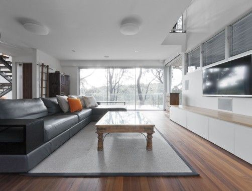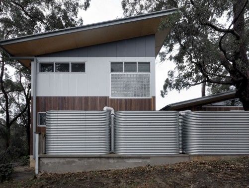 The trees surrounding the existing home were much loved mature local gums that provided essential shading in the summer. So it was important for us to re-design the home without significantly increasing its overall footprint and impacting on these trees. Thankfully a we were able to salvage some of the existing house, so we re-designed and re-built the existing lounge, dining and kitchen area and added a new second floor. The sustainable design features two linked pavilions: a single storey living pavilion to the east containing the kitchen and dining area, and a two-storey sleeping pavilion and living room to the west. We maximised the northern aspect and passive solar performance for the house, despite the ideal orientation being limited by the constraints of the site (wooded areas and sandstone outcrops). Strategic placement of windows and doors creates great cross ventilation, while active space heating is provided by a hydronic heating system. Reverse direction ceiling fans cool in summer and distribute warmth in winter, and hot water is provided by a evacuated tube solar system. A 3kW photo voltaic system makes a substantial contribution to reducing the reliance on power from the grid. All household potable water is supplied from 24,000 litres of water storage, making the house self sufficient for water. Low and zero VOC product use works towards a healthy indoor environment. Recycled timber has been used substantially for external cladding, internal flooring and joinery to ensure material sustainability. Highly rated insulation materials, low e glass in windows and doors, water and energy efficient fittings and appliances; and, the substantive use of reclaimed and recycled timbers throughout means that this unique, tranquil green building is a sustainable and healthy environment that sits beautifully within its bushland setting.